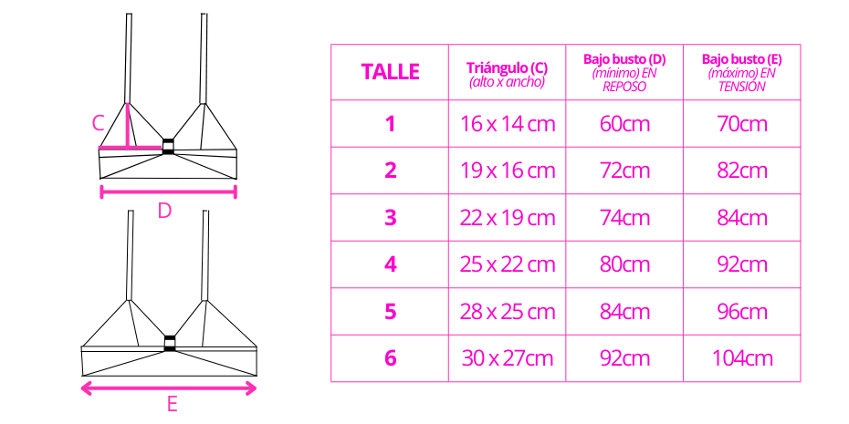 Contención: alta, corpiño reforzado a partir del talle 4 con calce similar a los corpiños con aro.