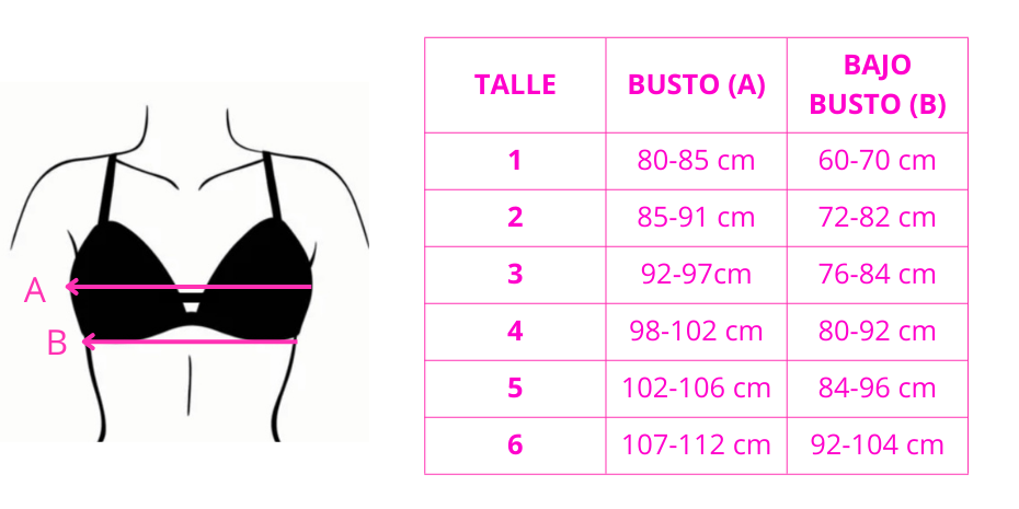Necesitás una cinta métrica o un hilo y una regla para medir tu busto y bajo busto. Si no sabés cómo hacerlo, hacé click aquí.