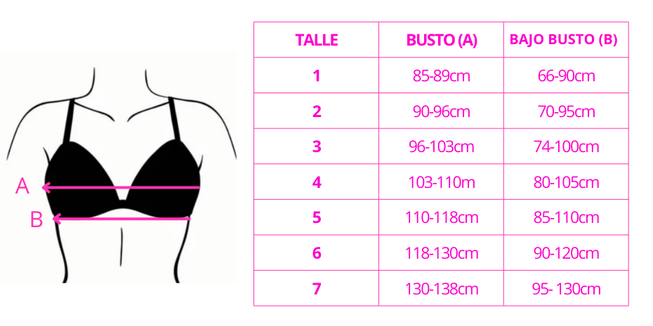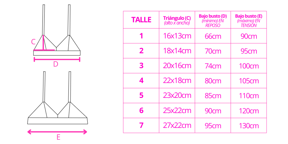 • DUDÁS ENTRE DOS TALLES?: Si dudas entre dos talles, elegí según el tamaño de la copa. El contorno es regulable, así que prioriza la copa para un ajuste ideal. La tela es elastizada por lo que siempre te recomendamos elegir un talle más chico para que la propiedad de elasticidad de la tela cumpla la función de ajuste y contención.