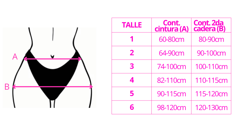 A - Contorno de primer cadera (medí donde calza la bombacha) rango mínimo y máximo sugerido.