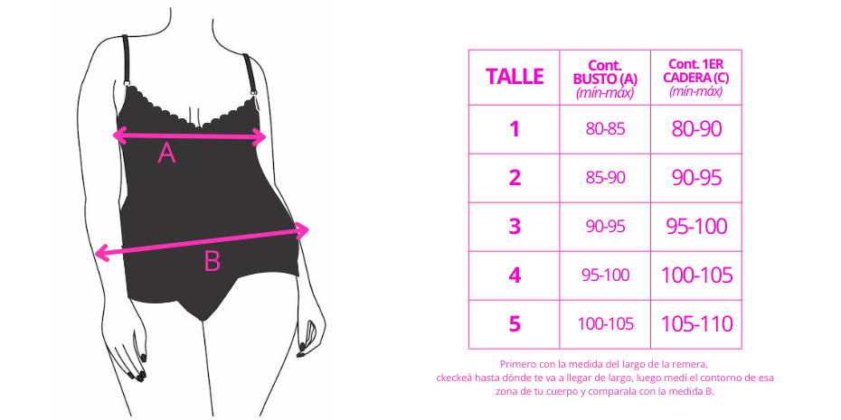 *Recordá que la primer cadera es mas arriba de la cola, es una altura estimativa, primero tomá la medida de largo de la remera y fijate a qué altuta te quedaría a vos, luego tomá la medida del contorno de esa zona de tu cuerpo y comparala con la medida B.