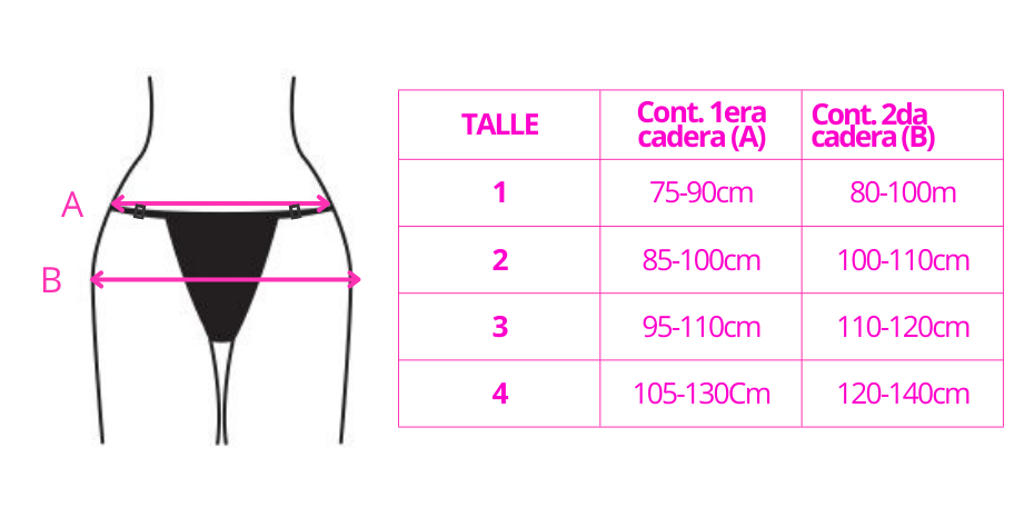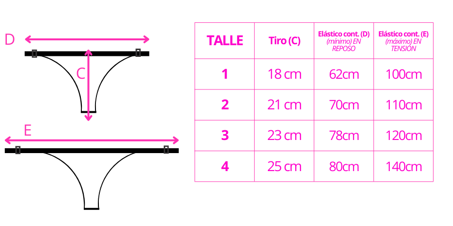 A - Contorno de primer cadera (medí donde calza la bombacha) rango mínimo y máximo sugerido.