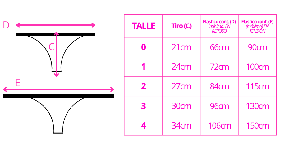 A - Contorno de primer cadera (medí donde calza la bombacha) rango mínimo y máximo sugerido.