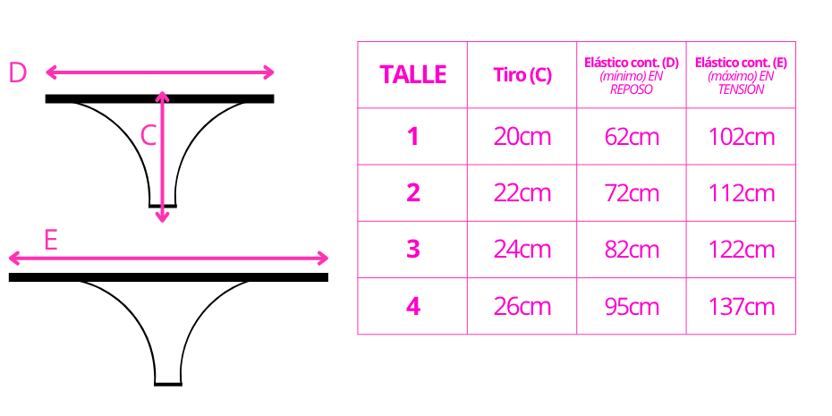 A - Contorno de primer cadera (medí donde calza la bombacha) rango mínimo y máximo sugerido.