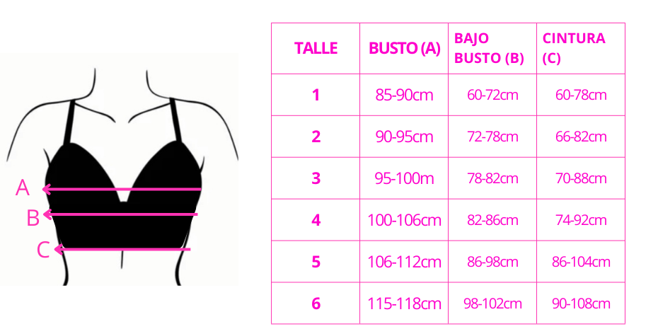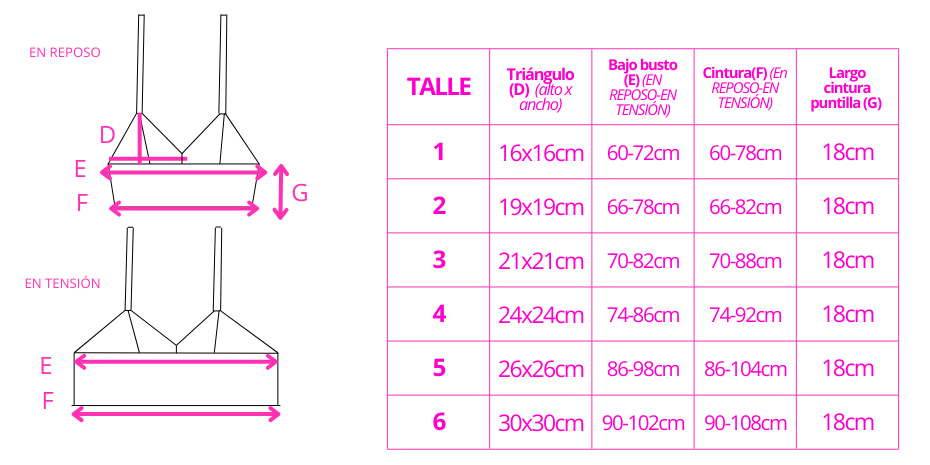 Refuerzos y terminaciones: elásticos de refuerzo de polyester en el interior de tazas y coleta que aportan mayor resistencia, contensión y aumenta la durabilidad a las telas y de la prenda. En bajo busto usamos elástico de 15 mm para aumentar la sujeción del busto y que no se suba con el uso. Los talles 4, 5 y 6 tienen coleta de contención lateral.