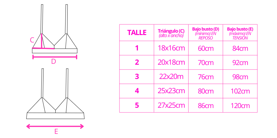 • DUDÁS ENTRE DOS TALLES?: Si dudas entre dos talles, elegí según el tamaño de la copa. El contorno es regulable, así que prioriza la copa para un ajuste ideal. La tela es elastizada por lo que siempre te recomendamos elegir un talle más chico para que la propiedad de elasticidad de la tela cumpla la función de ajuste y contención.