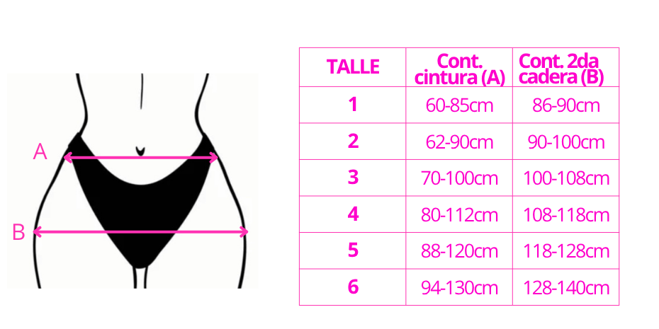A - Contorno de cintura (medí donde calza la bombacha, un poco más abajo que el ombligo) rango mínimo y máximo sugerido.