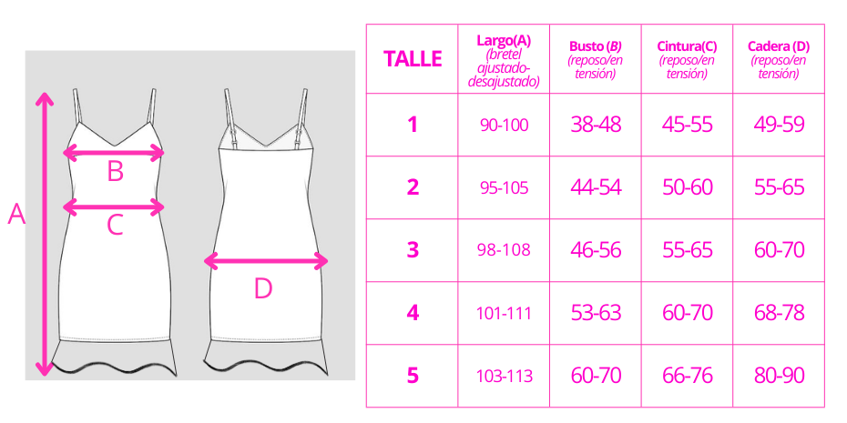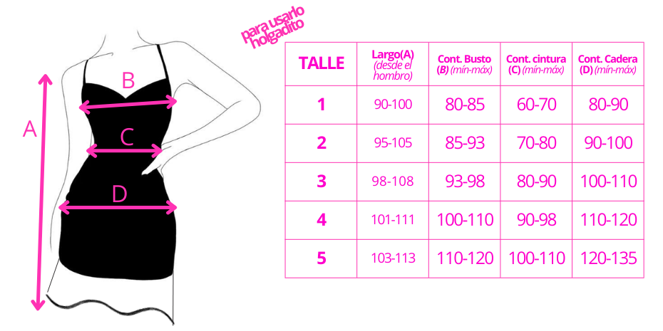 • Dani: : Busto (B) 88 cm, Cintura (C) 72cm, Cadera (D) 100cm. Usa talle 2.